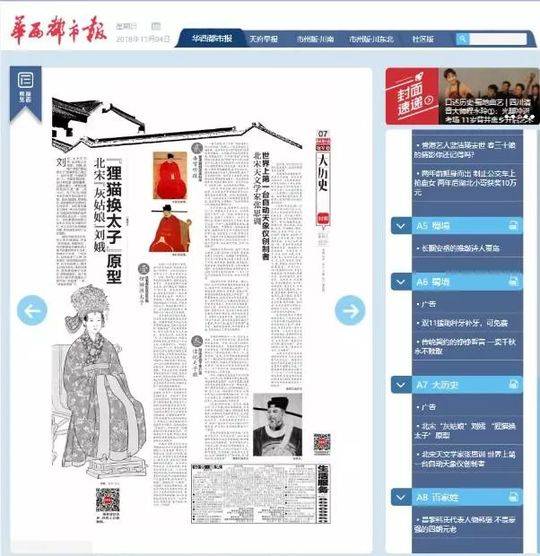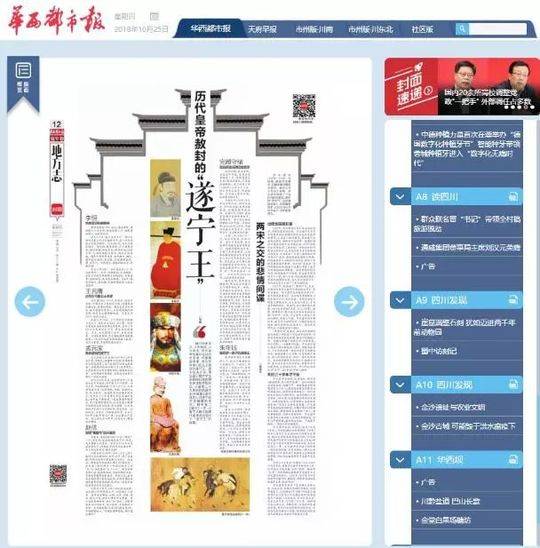 2018年10月25日,《华西都市报》第12版“地方志”栏目,刊发2018年9月29日“方志四川”微信公众号发布的《两宋之交的悲情间谍》(作者:葛丽平,作者单位:成都市双流区委史志办公室)及《巴蜀史志》2017年第6期文章《历代皇帝赦封的“遂宁王”》(作者:张帆,四川地方志网2018年4月9日发布)