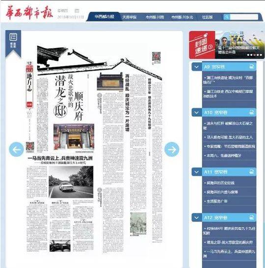 2018年10月11日,《华西都市报》第12版“地方志”栏目刊发“四川地方志”网文章《潜龙之邸 战火悲歌里的顺庆府》(作者单位:南充市顺庆区地方志办公室,载2018年第3期《巴蜀史志》,作者:卿远明)