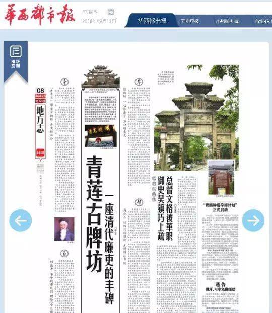 2018年9月13日,《华西都市报》第8版“宽窄巷”栏目刊发《青莲古牌 一座清代廉吏的丰碑》(此文刊发于《巴蜀史志》2018年第3期,原标题为《江油青莲镇古牌坊:一座为清朝著名廉吏牛树梅修建的德政丰碑》,作者:谢小东,作者单位:江油市地方志办公室,2018年7月4日“方志四川”微信公众号文章发布)。
