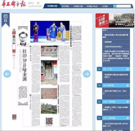 2018年12月20日,《华西都市报》第12版刊发“四川地方志”网2018.9.28日“方志四川”微信公众号发布的文章《挂印知县喻秉渊》,撰稿:巴中市恩阳区史志档案局)