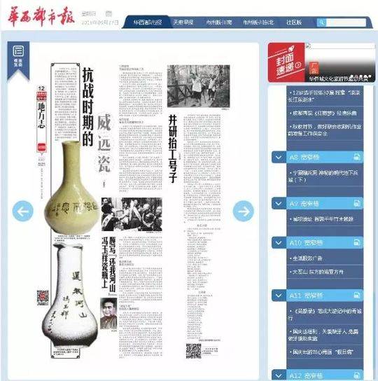 2018年9月27日,《华西都市报》第12版整版刊发四川省地方志工作办的2篇文章(《巴蜀史志》2018年第1期《抗战时期的威远瓷业》(作者:樊碧贞,作者单位:威远县史志办公室)及2018.7.31日“方志四川”微信公众号发布的《井研抬工号子》(作者:王英,作者单位:井研县地方志办公室 )。