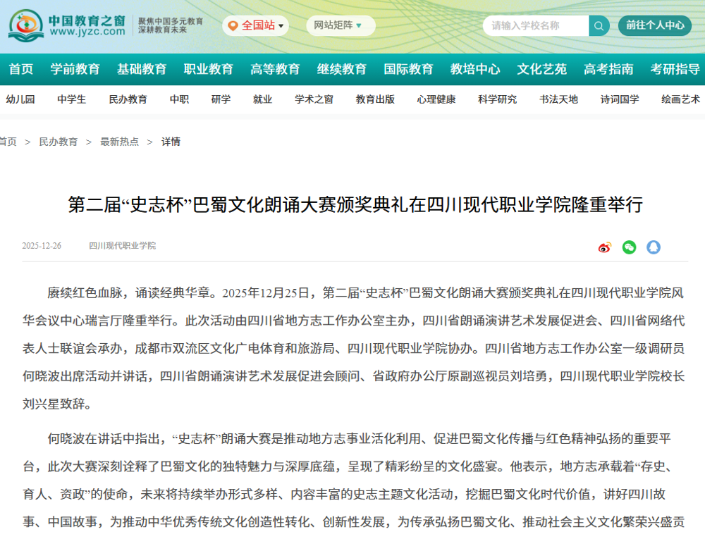 【中国教育之窗】第二届“史志杯”巴蜀文化朗诵大赛颁奖典礼在四川现代职业学院隆重举行