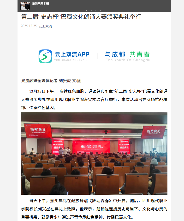 12月25日下午,“赓续红色血脉,诵读经典华章”第二届“史志杯”巴蜀文化朗诵大赛颁奖典礼在四川现代职业学院崇实楼瑞言厅举行,本次活动旨在弘扬抗战精神、传承红色基因。