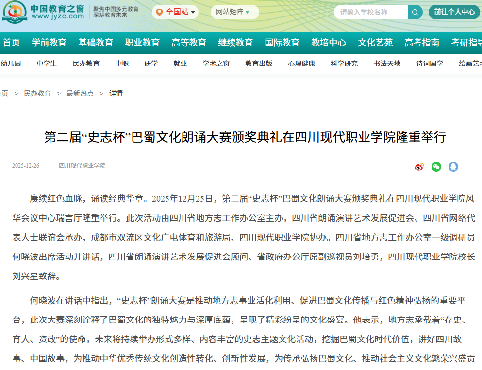 【中国教育之窗】第二届“史志杯”巴蜀文化朗诵大赛颁奖典礼在四川现代职业学院隆重举行
