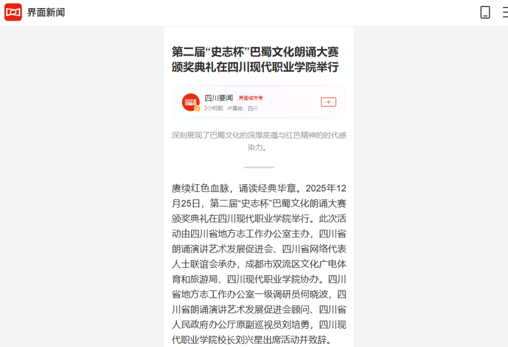 【界面新闻】第二届“史志杯”巴蜀文化朗诵大赛颁奖典礼在四川现代职业学院举行