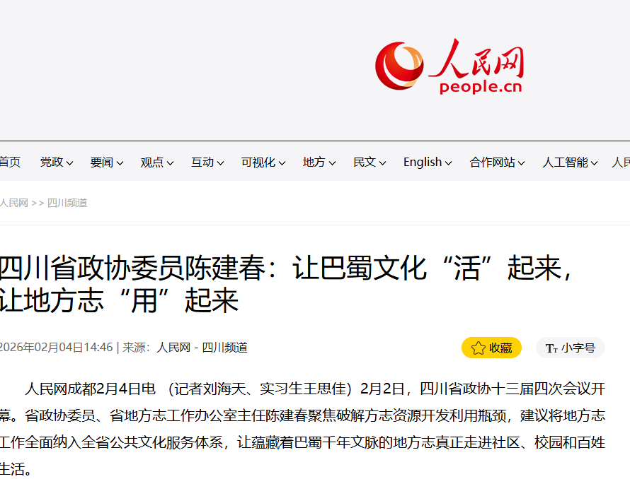 【人民网-四川频道】四川省政协委员陈建春:让巴蜀文化“活”起来,让地方志“用”起来