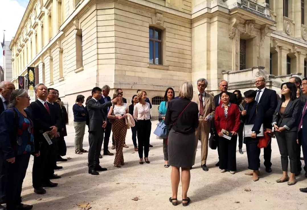 巴黎当地时间2019年9月5日,四川省林业和草原局副局长包建华(前右一)与四川省人民政府原副秘书长薛康(左三)、导演顾长卫(左一)、演员蒋雯丽(左二)等在法国国家历史自然博物馆参观“大熊猫走向世界150周年历史文化展”(包建华 供图)