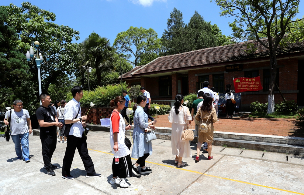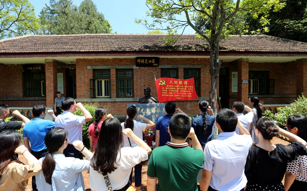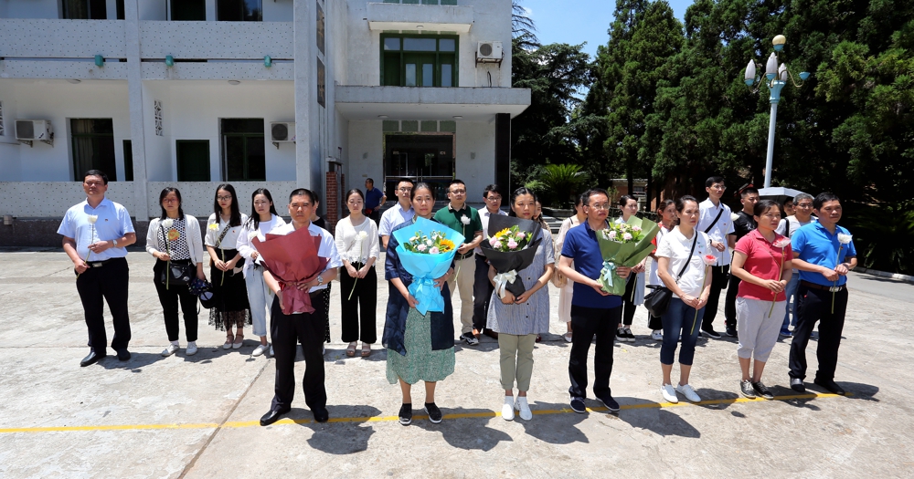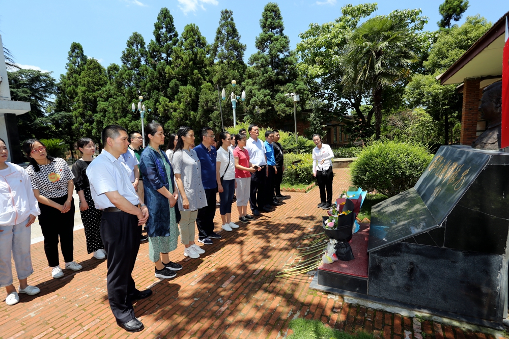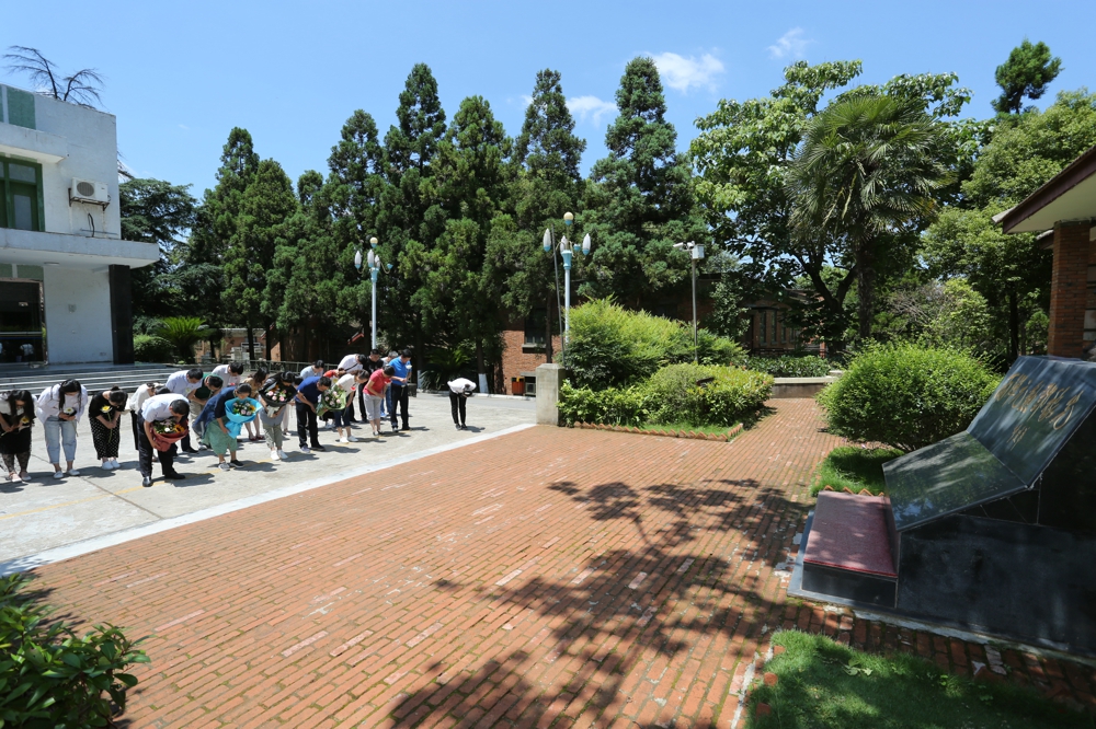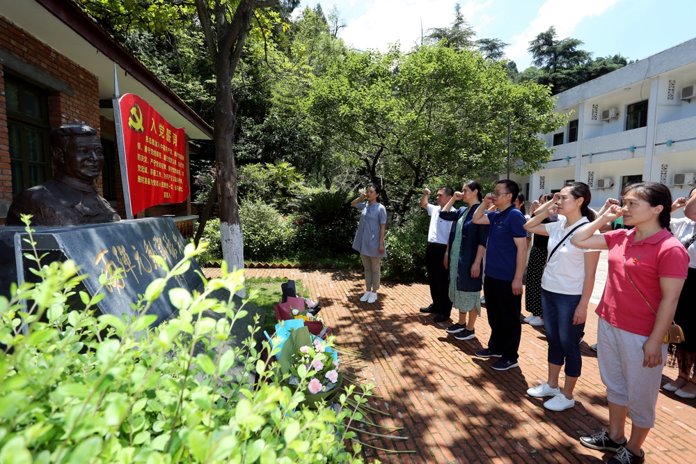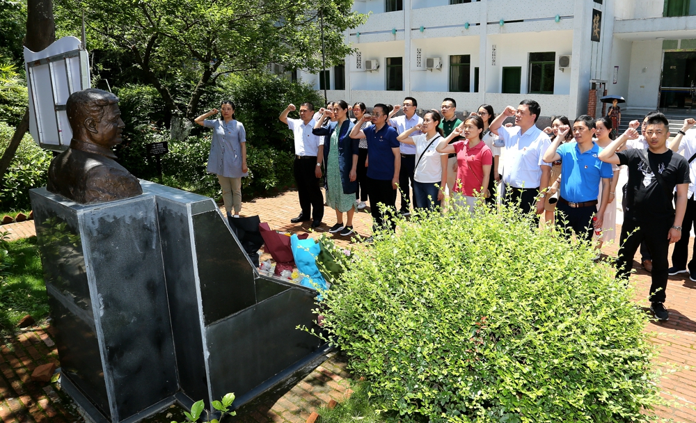 在邓稼先旧居,全体党员怀着无比崇敬的心情向邓稼先铜像敬献鲜花,并集体重温入党誓词。