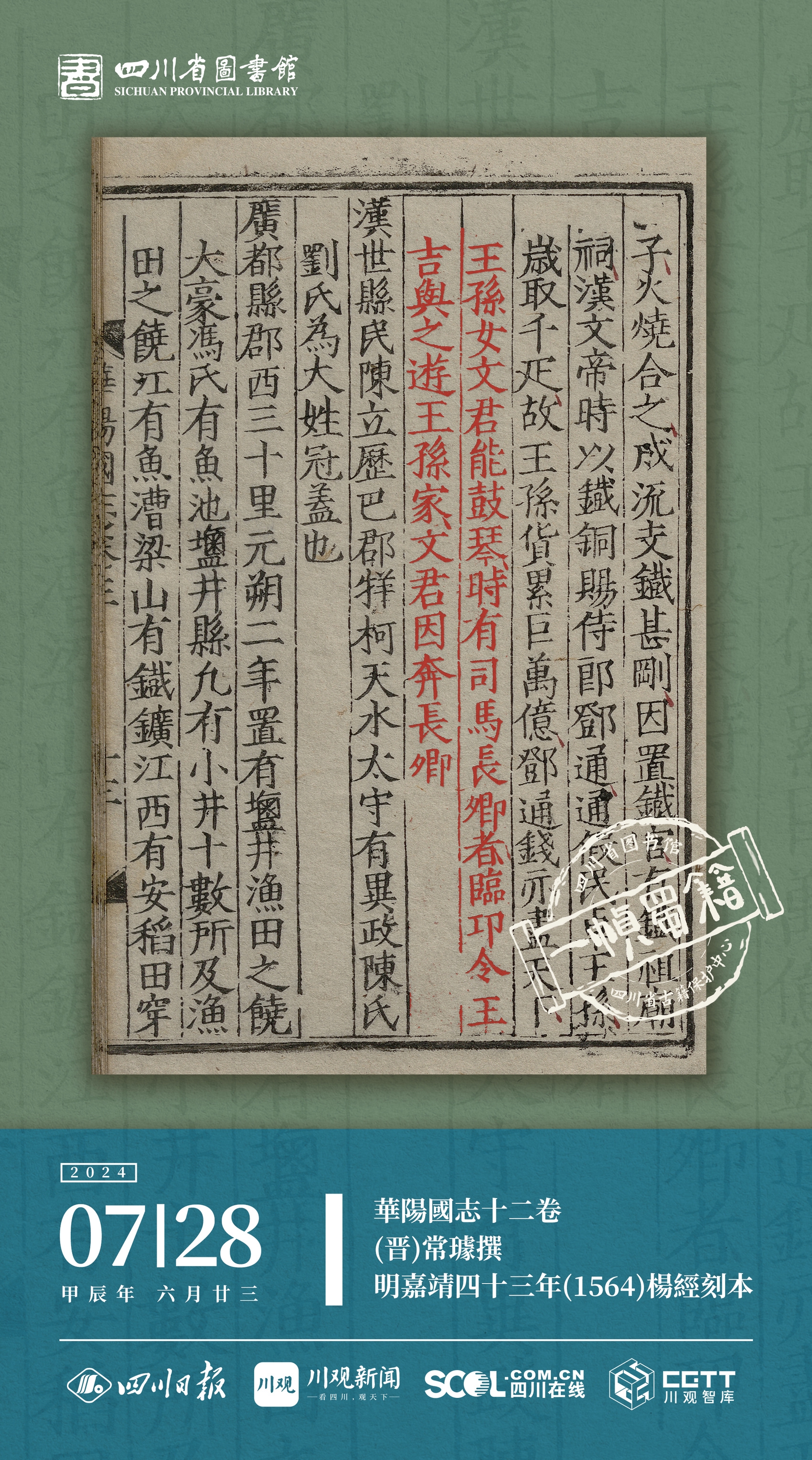 7月28日,一帧蜀籍带你倾听千年前的爱情故事。海报所选用图为华阳国志十二卷