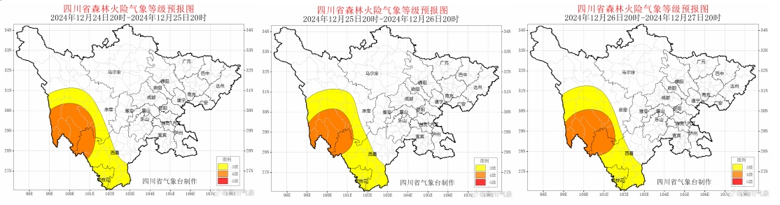 综合中央气象台和四川省气象台预报,12月底,我国又将进入一个升温阶段。12月27日之后到2025年1月3日之前,四川盆地大部时段以阴天间多云天气为主,盆周山区多分散小雨或零星小雨;川西高原部分地方12月29日至30日有雨雪天气,其余时段天气晴好,森林草原防火仍是重要任务。