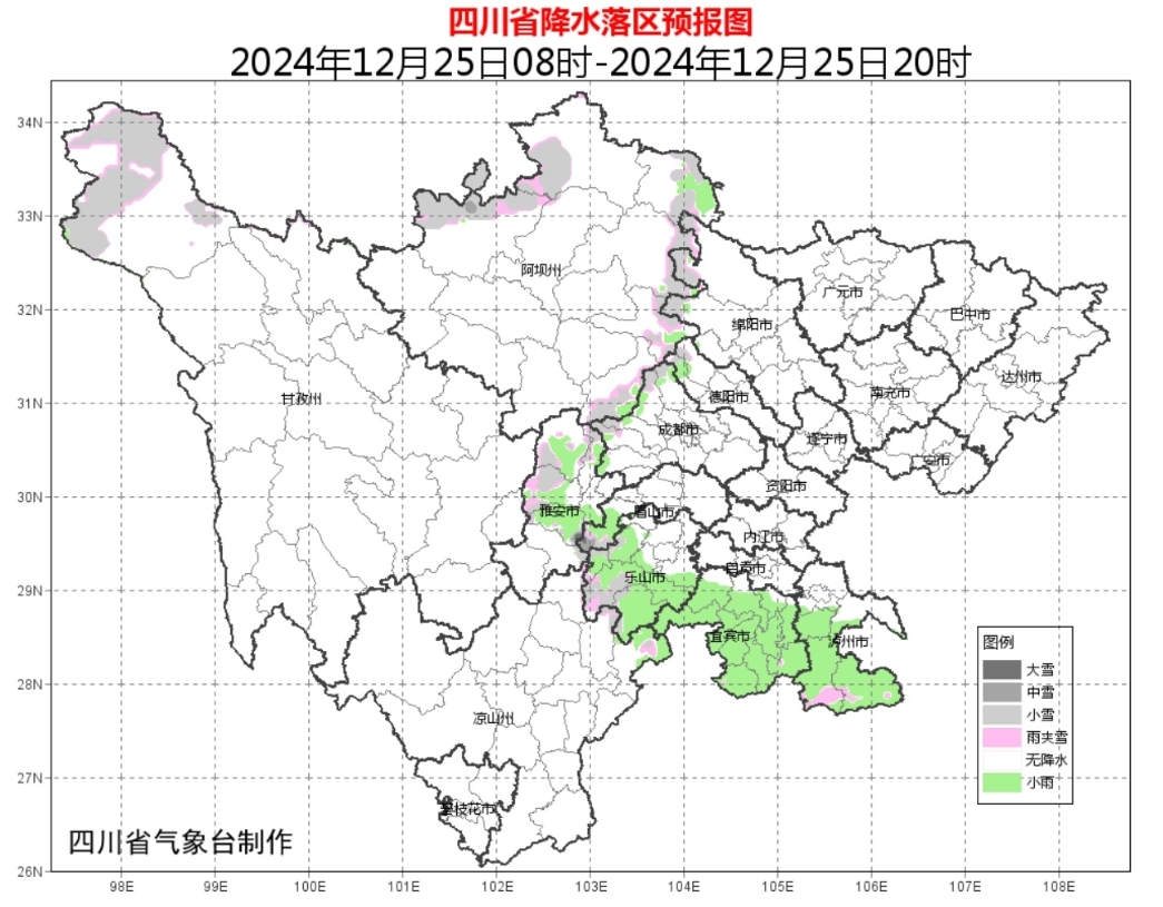 明天(12月25日)白天,泸州、宜宾、乐山3市及西部沿山有分散小雨,高海拔地区有雨夹雪或小雪;川西高原北部多云间阴有分散阵雪(雨)。