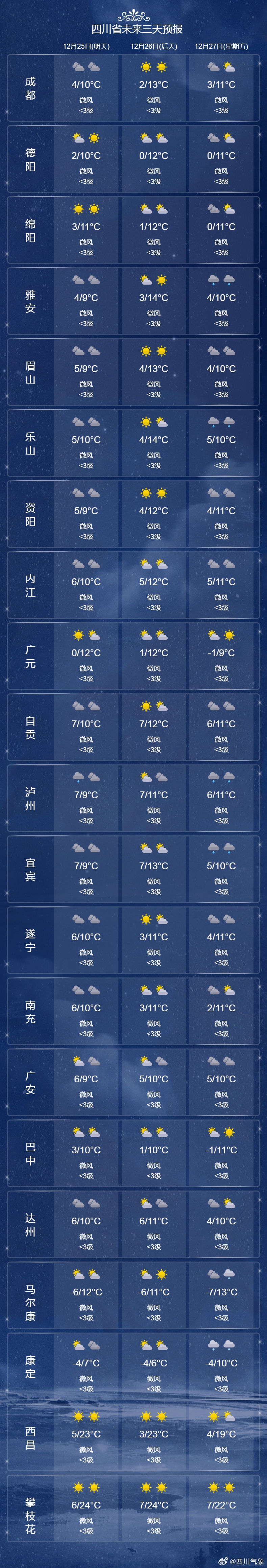 12月25日晚上到26日白天,盆周山区早晚有分散小雨,高海拔地区有雨夹雪或小雪;川西高原北部东部阴天间多云有阵雪(雨),局部有中雪。