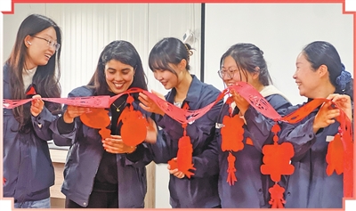 会议室里,大家搬桌椅、挂彩灯、贴窗花,布置春节联欢的场地。办公室文员宋朝阳拿起窗花说:“这些新年装饰的拉花,是提前一个月专程去中国超市预订的,就是为了让大家在海外也能感受到浓浓的中国年味。”