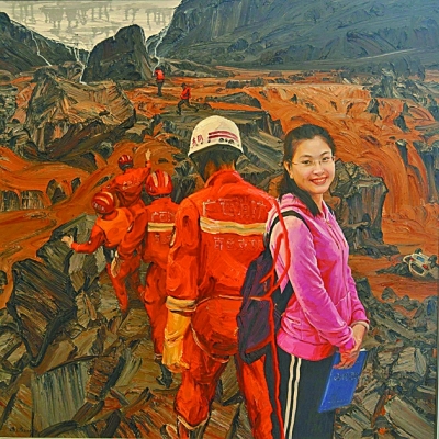 黑色巨石被洪水冲得脱落,土红色的洪水在咆哮,事故车辆在洪水中翻滚,救援队伍正在紧张地搜救。而搜救队员的身后,黄文秀的微笑定格在油画上……广西美术家协会副主席杨诚创作的油画作品《永远的微笑》将观众带入那个悲壮的夜晚,让人们记住了黄文秀永远的微笑。