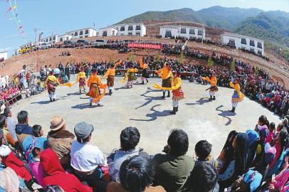 近日,甘孜州得荣县白松乡同归村,藏族群众聚集在一起庆祝搬迁新居。 省扶贫开发局供图