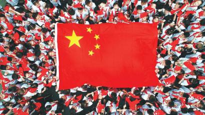 9月1日,仁寿县各中小学校把“爱祖国、爱国旗”作为开学典礼活动主题。图为该县文宫镇中心小学校二年级的同学们簇拥着国旗。 潘建勇摄(视觉四川)