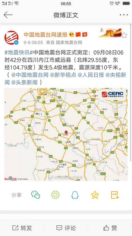 【08:40报道】今晨地震 让内江境内部分线路供电受影响