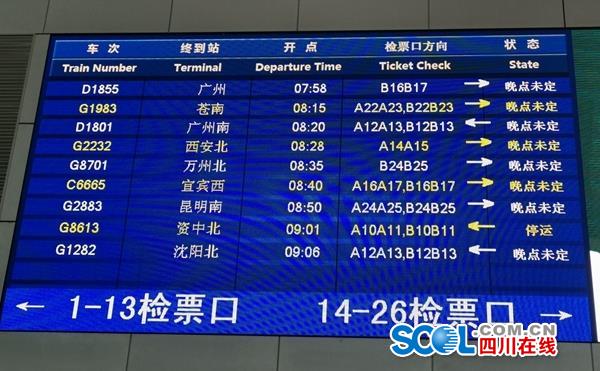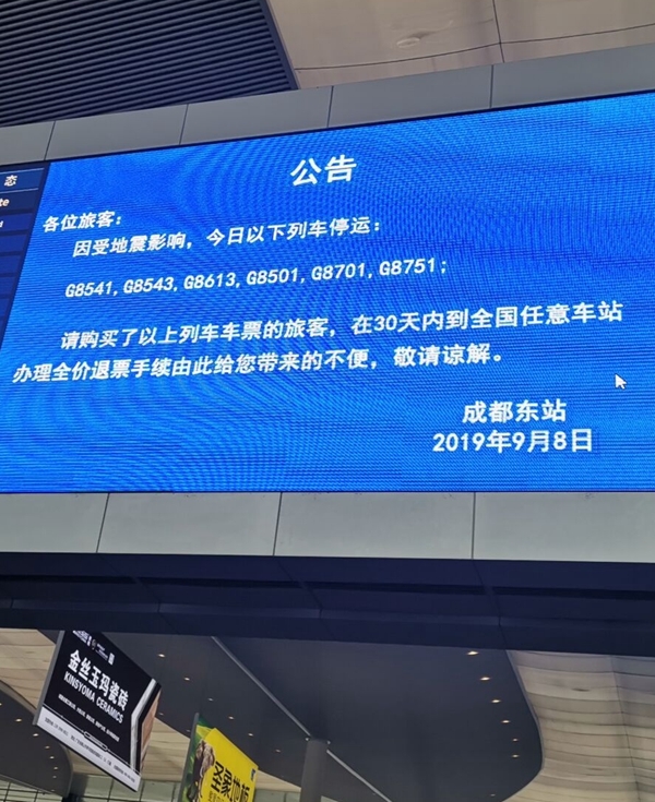 9月8日8:00,受今晨内江地震影响,成都东站G8541、 G8543、 G8613、G8501、G8701、G8751等车次列车停运。D1855、G1983、D1801、G2232、C6665、G2883、G1282等多趟列车晚点,发车时间未定。【详细】