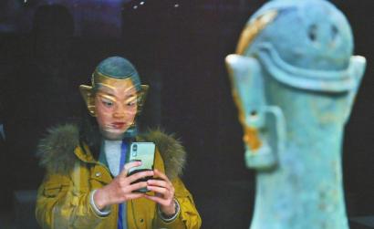 三星堆发现九十周年纪念特展,一位嘉宾拍摄戴金面具青铜人头像,倒影映在嘉宾脸上,像是戴上了一个面具。 本报记者杨树摄(视觉四川)
