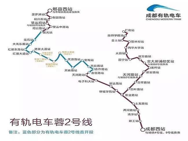 有轨电车蓉2号线非首开段线路长25.6km,设车站23座,线路配置列车采用“两动一拖两悬浮”5模块100%低地板车型,供电采用“接触网+车载储能”方式。有轨电车蓉2号线非首开段开通后,将与地铁2、4、6、9号线及市域铁路成灌线形成换乘,串联起沿线电子科技大学、西南交通大学等知名院校及菁蓉小镇、高新综合保税区、工业园区等片区。