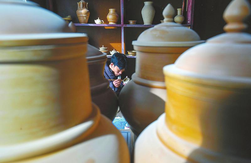 12月的冬日阳光透过壤巴拉藏式陶艺传习所的窗口,在飞转的泥坯上折射出金色的光芒。在壤塘县上壤塘乡仁棚村的这间陶艺传习所,泽郎斯加正在陶器原型上修坯。泽郎斯加和传习所的18名学员,都来自于壤塘县贫困牧民家庭,经过六年的学习和进修,他们在陶艺传习所已熟练掌握了藏陶的拉坯、修坯、烧制等综合技艺,并完成了德育、藏文、汉语、数学、电子商务、藏汉文书法、基础绘画等课程培训。