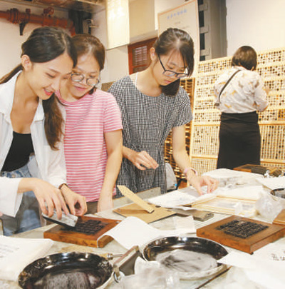 台湾大学生在江苏省南通市唐闸古镇体验活字印刷。许丛军摄(人民视觉)