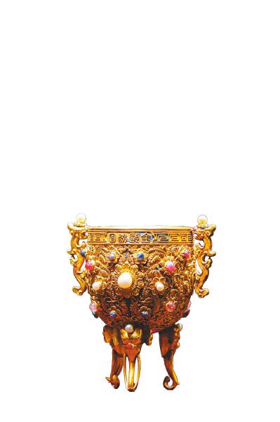 金沙遗址博物馆“金玉琅琅——清代宫廷仪典与生活”展持续至4月5日,汇集故宫众多贵重奢华的清代皇家珍品。其中,乾隆下旨置造的传家宝“金瓯永固”杯,外壁满錾宝相花,花蕊镶嵌各式珍珠及红、蓝宝石,华美异常。据介绍,这是清宫内皇帝的专用酒具,金瓯之名寓意国土永保、江山万代。2018年底,这件文物还曾登上《国家宝藏》第二季。光绪皇帝大婚时的众多物件,也纷纷亮相展览。金“囍”字如意,不仅刻有“囍”字,还有“百子呈祥”“长宜子孙”等吉祥话。如意旁边还有一幅盖有“慈禧皇太后御笔之宝”的“龙”字卷轴,足见慈禧太后对这场婚礼的重视。金龙钮“皇后之宝”,则是1922年溥仪与婉容结婚时使用过的玺印。