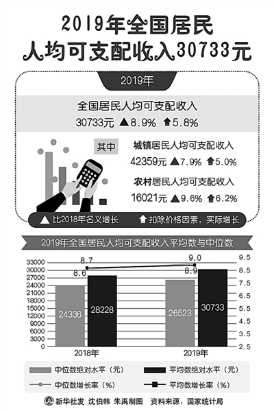 30733元——2019年全国居民人均可支配收入30733元,比上年名义增长8.9%,首次突破3万元。增速比上年加快0.2个百分点;扣除价格因素实际增长5.8%,与经济增长基本同步,与人均GDP增长大体持平。