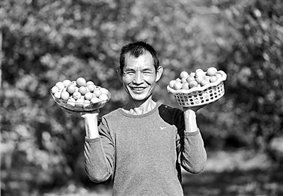 广西柳州市融安县村民展示刚刚采摘的金橘。新华社发