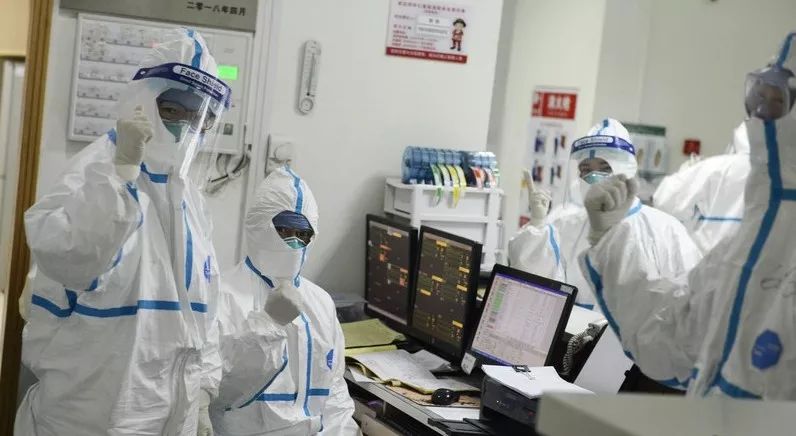 2020年1月22日,武汉市中心医院呼吸与危重症医学科监护室的医护人员面对镜头做出“加油”手势(图片来源:荆楚网)