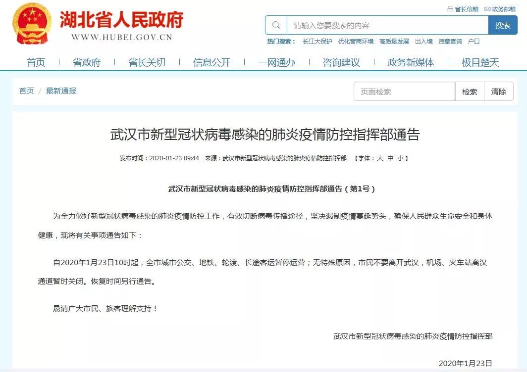 武汉市新型冠状病毒感染的肺炎疫情防控指挥部发布通告,自2020年1月23日10时起,全市城市公交、地铁、轮渡、长途客运暂停运营;无特殊原因,市民不要离开武汉,机场、火车站离汉通道暂时关闭。
