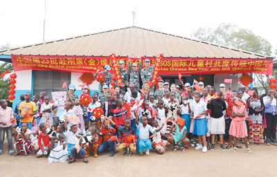 在刚果(金)布卡武的SOS国际儿童村,中国第二十三批赴刚果(金)维和医疗分队与当地儿童欢度春节。