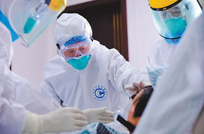 2月6日,福建省南平市第一医院隔离病房内,医护人员在为患者抽取动脉血。 邵玉姿 肖添财摄影报道