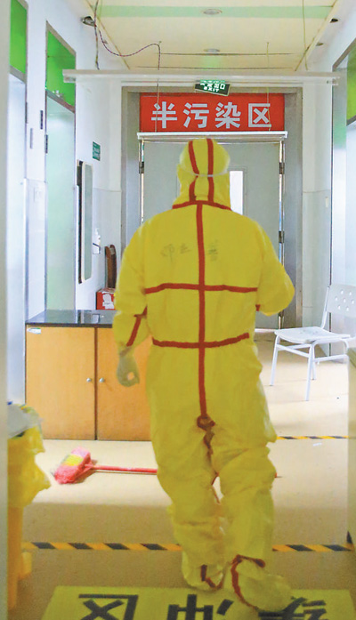 2月5日,在湖南衡阳南华大学附属南华医院,医护人员穿好防护服经过缓冲区走向隔离病房。曹正平摄(人民视觉)