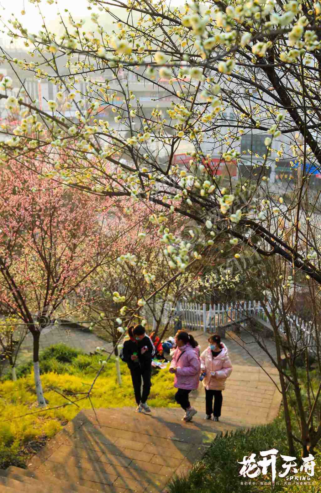 ▲遂宁市船山区永兴镇春梅盛开,人们戴着口罩赏花休闲。