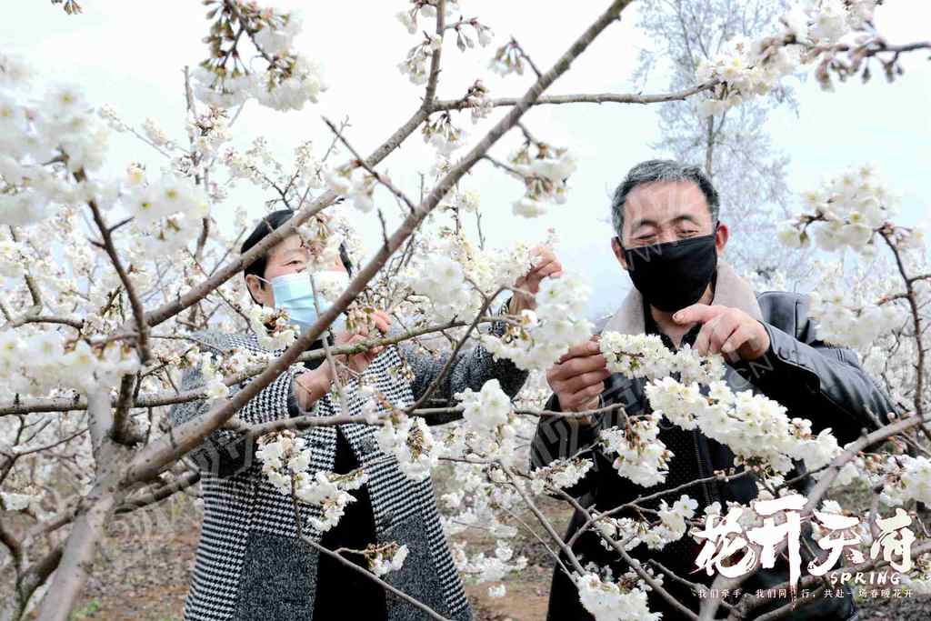 ▲仁寿县怀仁街道吊庆社区,果农们正在对樱桃树进行疏花。