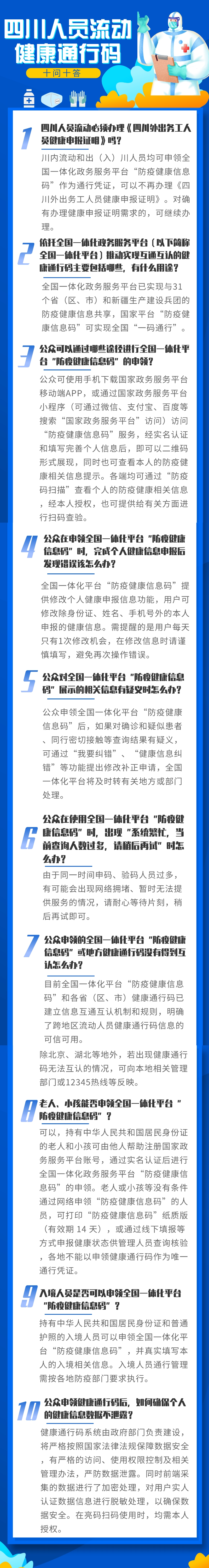 4月1日,四川省卫健委官方微信发布四川人员流动健康通行码十问十答,就市民关心的“四川人员流动必须办理《四川外出务工人员健康申报证明》吗”等十个问题进行解答。具体内容如下: