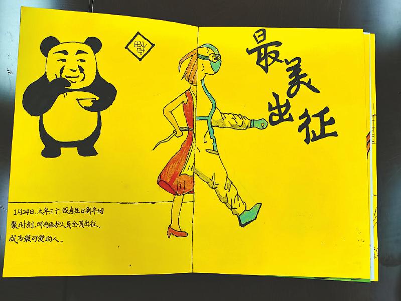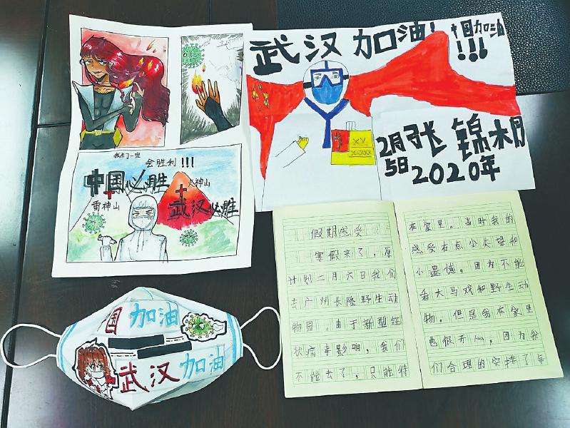 更多从学校征集的物品,表达着孩子们对祖国的热爱。成都天府四中五年级六班的小朋友自发创作了一个“疫情无情,人间有爱”的绘本,以时间为线,画下医生们的“最美出征”、火神山雷神山医院的建设,以及“保护野生动物”的思考。有的小朋友在口罩上写下“中国加油”几个大字,有的则画了卡通漫画,写下“我们一定会胜利”的美好祝福。