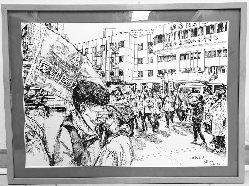3月6日,成都医学院第二附属医院核工业四一六医院援鄂医疗队出征,徐小丹画下“决战前夕”的那一幕:飘扬的旗帜下,年轻的夫妻戴着口罩相拥而别。他们身后,是一大队医务人员整装待发;3月20日,资阳第二批援鄂医疗队的队员也画下资阳一院7名队员的铅笔画。画中他们是身穿防护服的葫芦娃,高举右手,向病毒发起冲击……