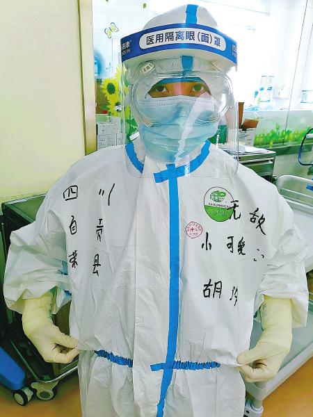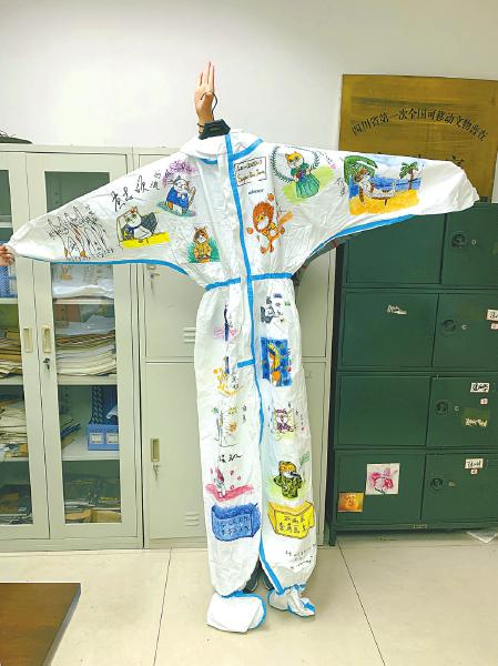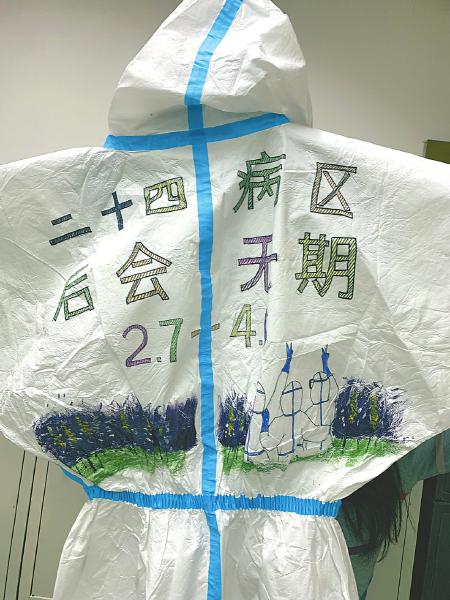四川大学华西医院援鄂医疗队在武汉24病区查房医生和慕洁画了卡通画的防护服。慕洁供图