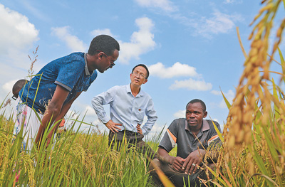在位于布隆迪布班扎省吉航加县的中国援布杂交水稻示范田内,中方专家向当地农民传授水稻种植技术。本报记者 吕 强摄