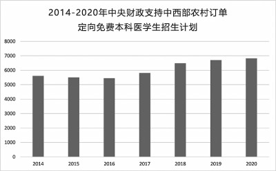 2010年起,为提高我国农村医疗卫生服务水平,补充中西部地区乡镇卫生院的全科医生,国家开始实施“农村订单定向医学生免费培养计划”,至今已实施10年。自2017年,国家免费医学生招生计划明显增加,本科阶段招生计划人数由以前的5000余人,逐步增长到了2020年6822人。