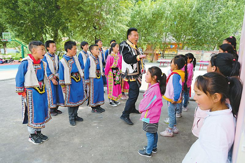 在松潘县小姓中心校读5年级的共金见措,在学校兴趣班学习了3年的多声部民歌演唱,现在已经学会7首原汁原味的多声部民歌。而教他们的特聘教师,正是泽旺仁青。“这个地方我们的声音要掉下去哦,再唱‘则诺’……”泽旺仁青目前带24个学生,学习藏羌多声部民歌,松潘县小姓中心校也是当地少数系统性地开设藏羌多声部民歌兴趣班的学校。