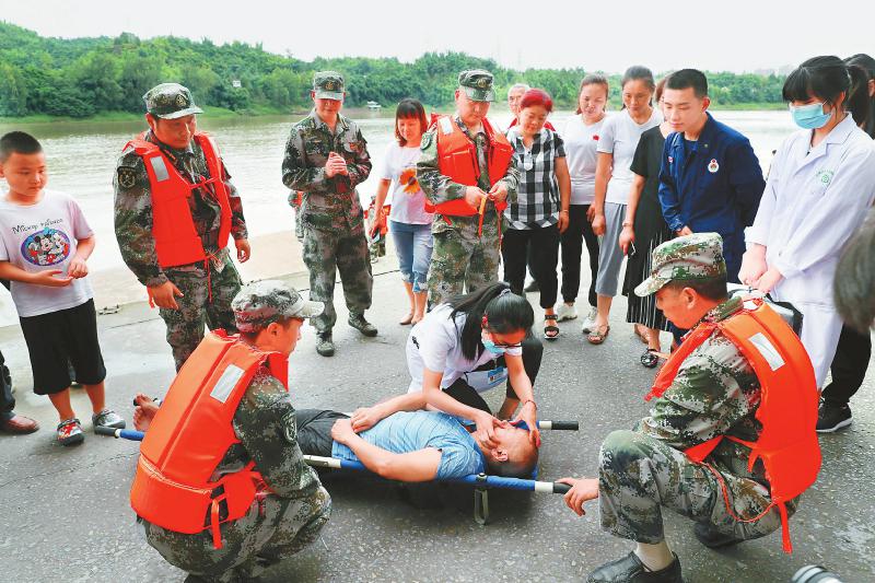 7月13日,广安市广安区北辰街道渠江边,北辰街道基干民兵应急排党员在参加防汛减灾实战演练。图为参演人员在现场进行溺水救护项目演练。 廖小兵 摄(视觉四川)