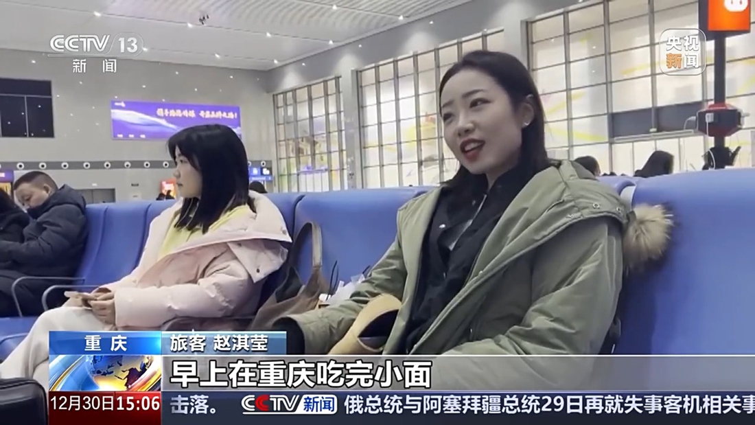旅客赵淇莹:我是来重庆旅游的,早上在重庆吃完小面,然后中午就可以去成都吃美食。高铁很方便,真的太给力了。