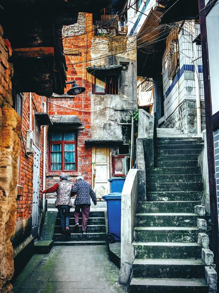 同为特色民居的“小重庆”磁器口,宋代因水而生,清代以来受瓷器商业因素影响而兴。磁器口有两条主要街道,磁正街和横街。重庆大学建筑城规学院教授李和平,曾在《论山地传统聚居环境的特色与保护》中论述,磁器口40余条街巷垂直于这两条主干道发展,整个街区随地形布局灵活。从具体建筑来看,磁器口建筑又非常善于“自由生长”,山地台式建筑是其中的代表。“量其广狭,随曲合方”,没有固定的格局和定式,建筑上部空间的自由扩展乃采用“占天不占地”的手法,尽量缩小建筑的基底面积,上部建筑尽量向四周伸展,以争取更多的使用空间,常用的形式有12种之多,如悬挑、吊脚、横跨、附崖等等。