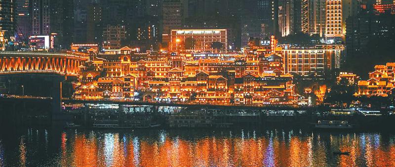 现代“网红”建筑,常常以一种脱离于“背景”的方式,赫然存在于城市中,形成独树一帜的景色。重庆洪崖洞的背面,是一排排形态各异、有着简约流畅线条的现代大厦。唯独洪崖洞片区,新修的仿古建筑保留了传统吊脚楼形式,面朝嘉陵江,就势而建,南高北低落差近75米,横向绵延约80米。层层叠叠的吊脚楼在夜晚点灯以后,金黄璀璨,十分夺目,与经典动漫《千与千寻》里的房屋场景高度相似,这种现实空间与动漫空间交叠的奇妙感,让洪崖洞近年来在网络走红,受到不少年轻人喜爱。