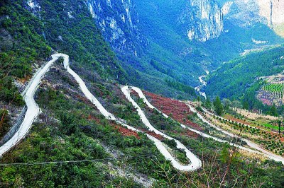 崇山峻岭中修筑的下庄路。吴光平摄/光明图片