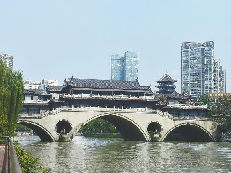 至明清时期,往来成渝的陆上要道——东大路兴起,锦官驿成为东出成都的第一大驿站,也是当时成都最繁华的地方。我们登上合江亭,向如今安顺廊桥的方向眺望,仿佛穿越回明清时期的锦官驿:锦江河道上,往来客商不绝,酒铺、旅店林立。大量的缫丝、刺绣、印染等手艺人、役夫、商人生活在锦江一线,他们是当时成都最为活跃的“经济人”,并带动商铺、酒楼、茶肆、旅店乃至烟花业高度发达。