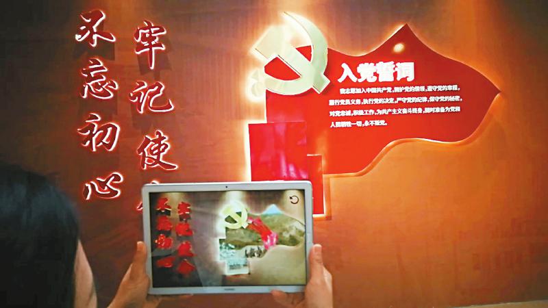 4月2日,成都市“宏明记忆”党性教育示范基地展厅,参观人员用手机对着现场印有入党誓词的鲜红党旗图案扫描,AR的党史课堂一 一展现在屏幕上。 四川日报全媒体记者 衡昌辉 摄